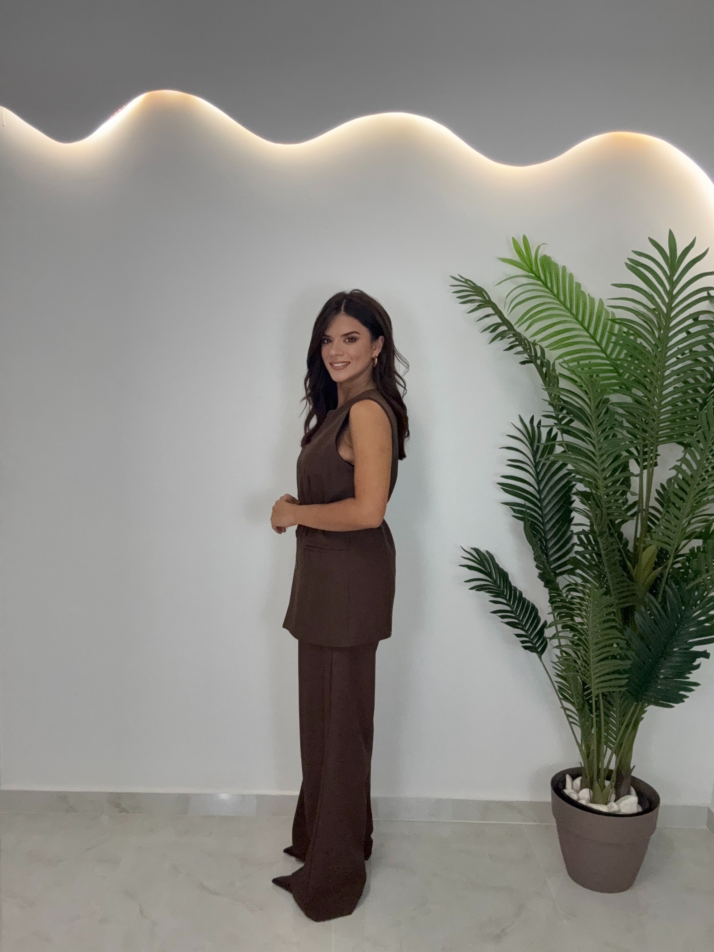 Γυναικείο σετ με γιλέκο και παντελόνι σε καφέ σοκολατί χρώμα