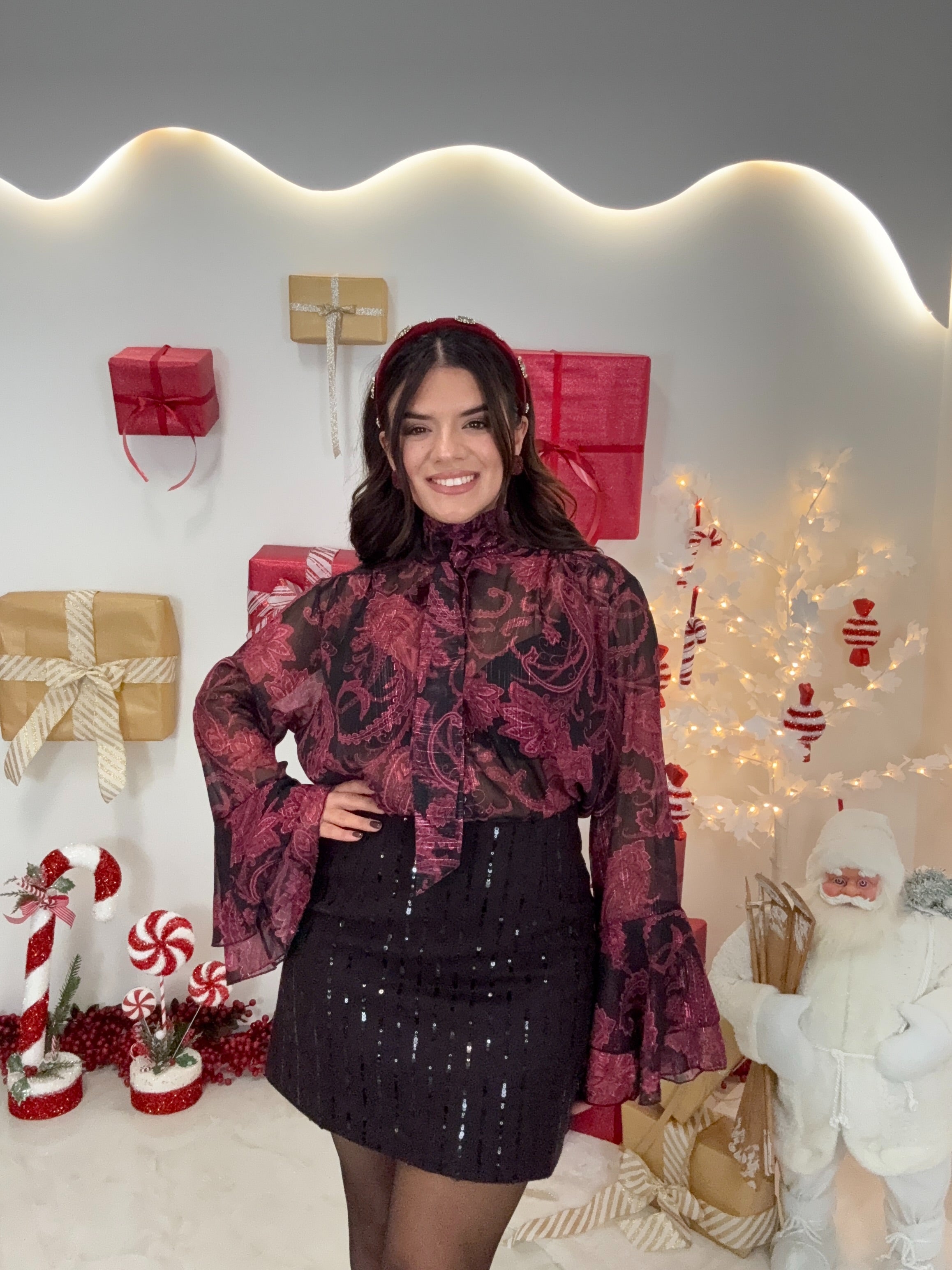Φούστα σε μπορντώ σκούρο χρώμα διακοσμημένη με παγιέτες σε μαύρο χρώμα