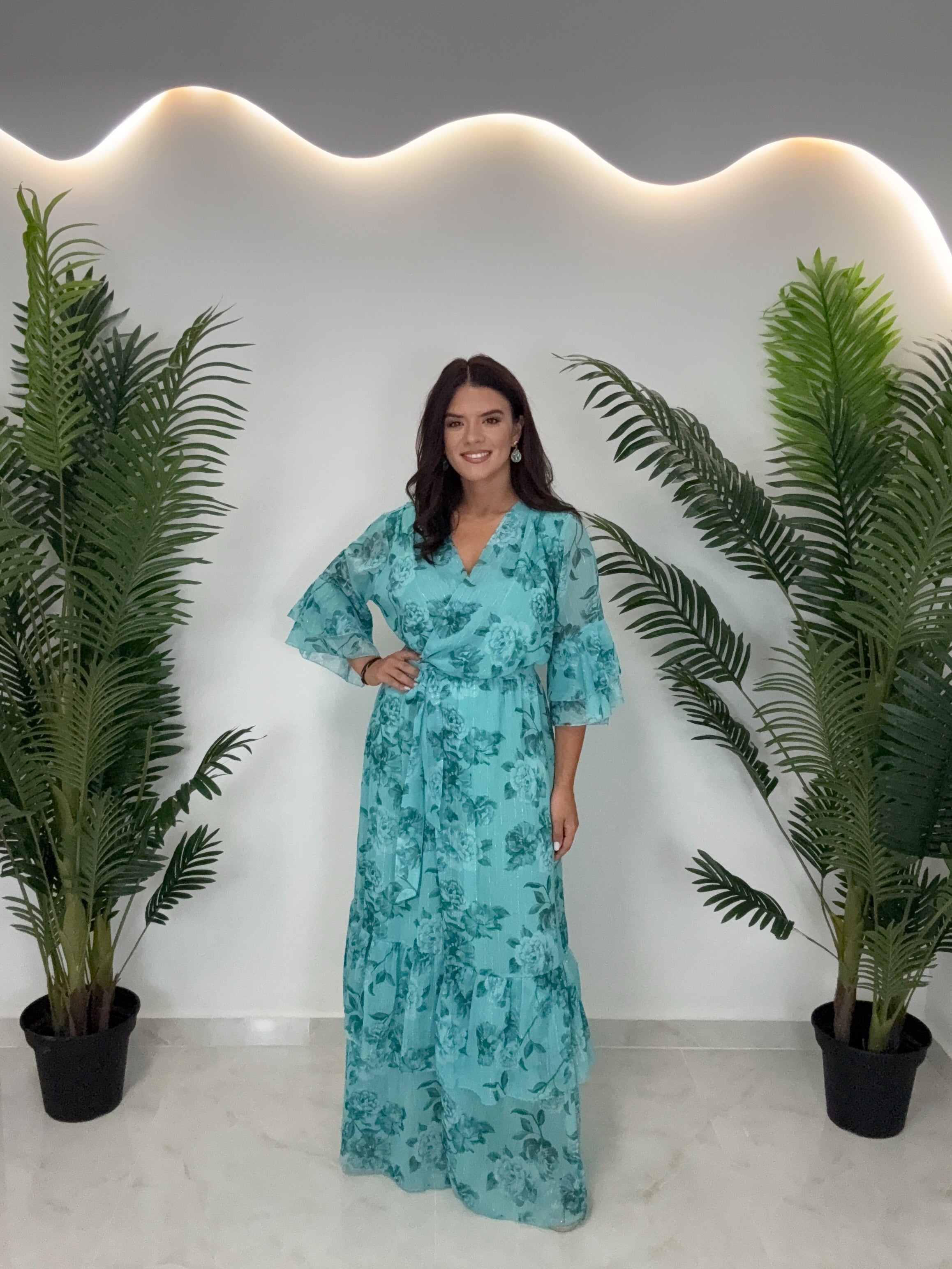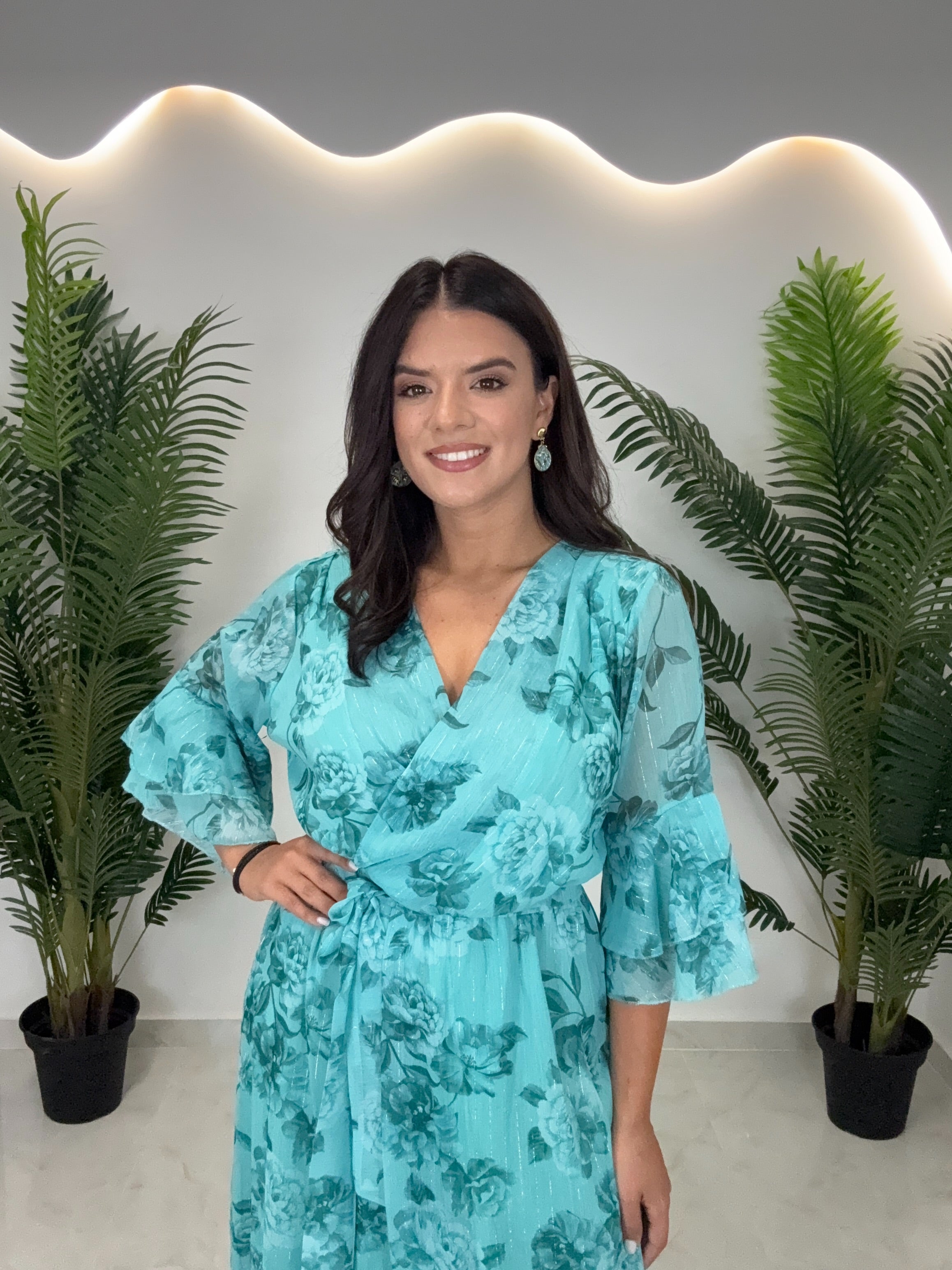 Γυναικείο φόρεμα floral σε τιρκουάζ χρώμα