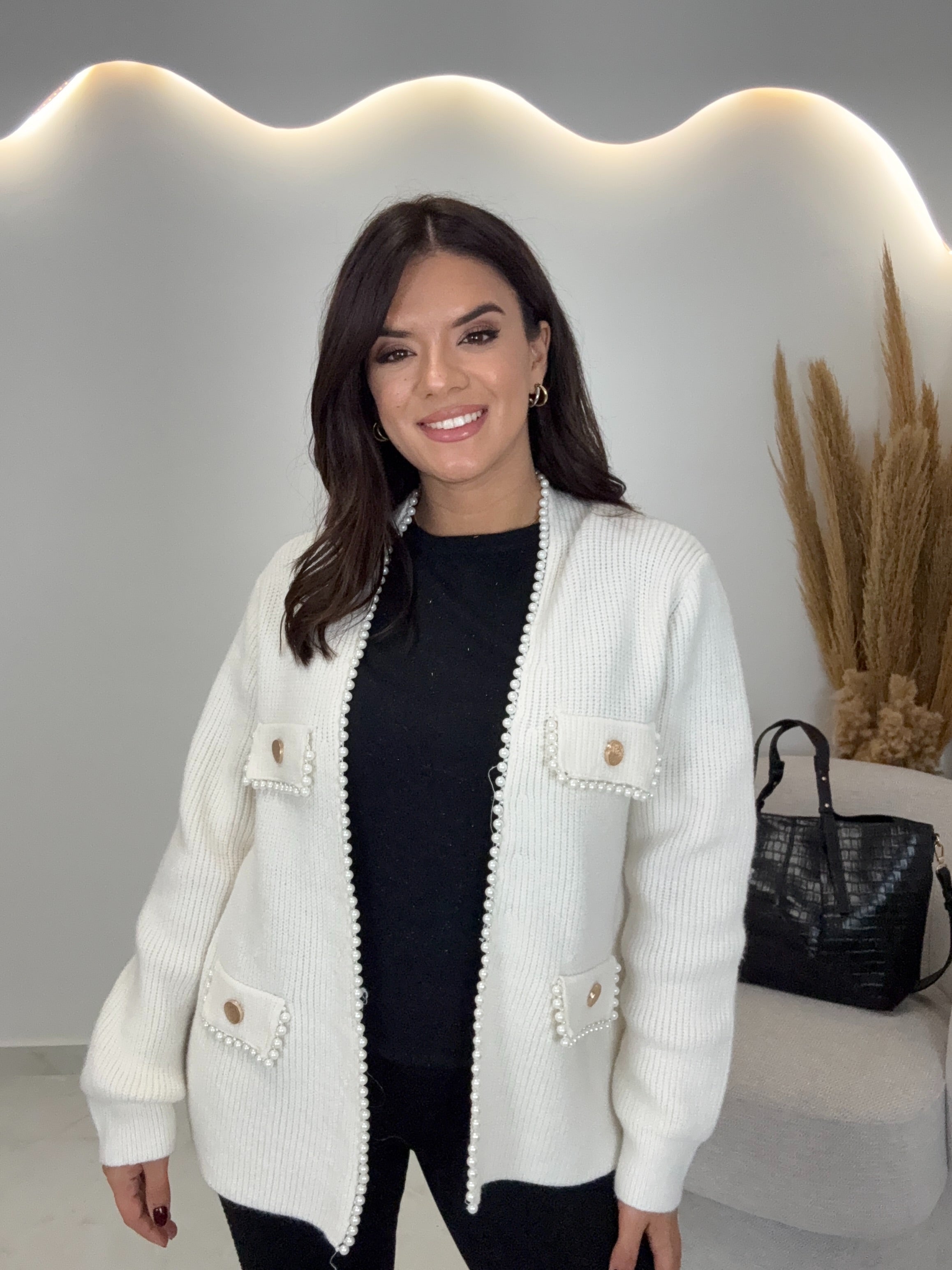 Πλεκτή ζακέτα με διακοσμητικές πέρλες και χρυσά κουμπάκια